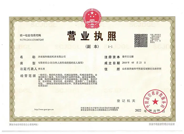 濟南福和數控機床有限公司連年被評為“ 山東省重合同守信用企業 ”,通過了ISO9001國際質量管理體系、ISO14001國際環境管理體系認證,嚴格按照各管理體系的要求,促進企業持續健康發展。